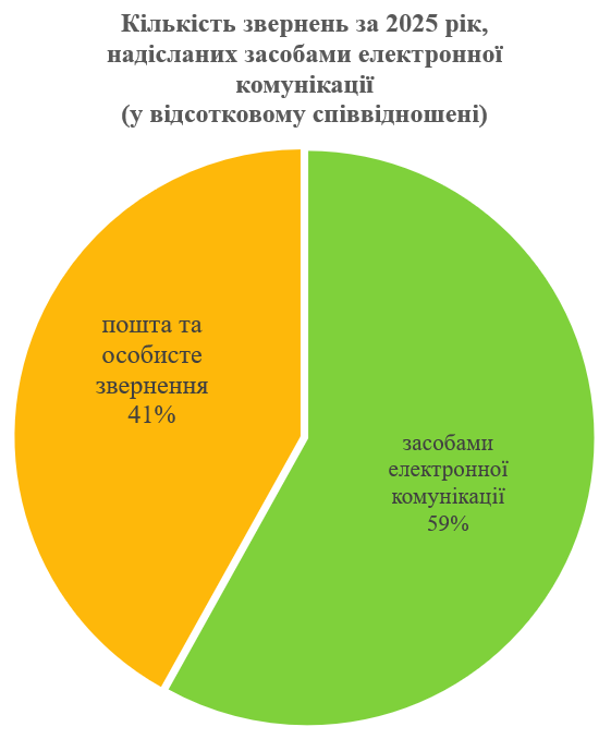 Із загальної кількості звернень у 2025 році засобами електронної комунікації надійшло 205 звернень (додаток № 2), що становить 59% у відсотковому співвідношенні від загальної кількості звернень. Сюди входять звернення, що надійшли електронною поштою (158), а також через підсистему ЄСІТС «Електронний суд» (47). В минулі роки цей показник коливався на рівні 47-50%, що свідчить про зростання ролі електронних комунікацій з громадянами та юридичними особами, які звертаються до апеляційного суду.