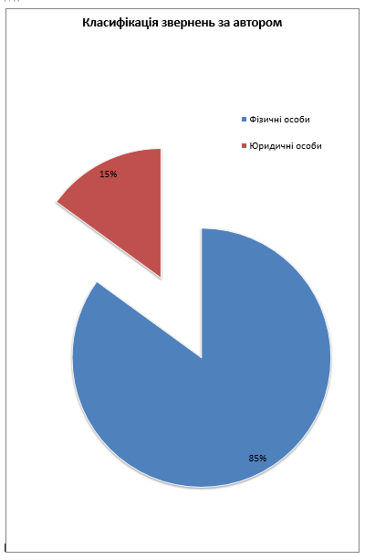 25 звернень надійшло від юридичних осіб, що становить 15% від загальної кількості звернень (додаток №2).