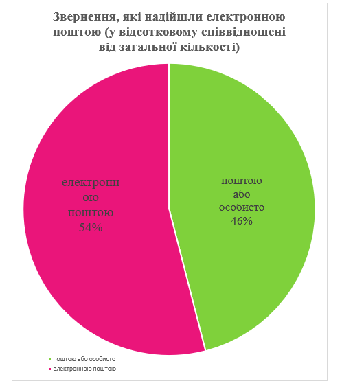 У першій половині 2025 року електронною поштою надійшло 90 звернень, що становить більше як половина від загальної кількості звернень (54%) (додаток №3).