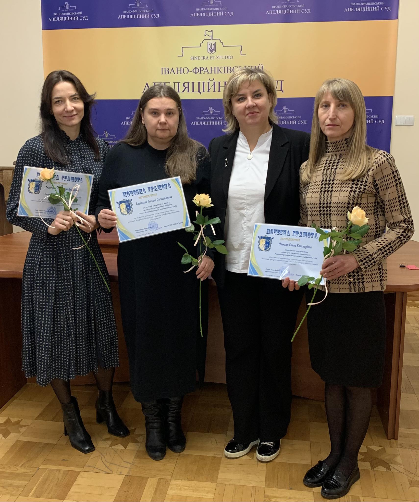 - Почесні грамоти - помічнику голови Івано-Франківського апеляційного суду Любомирі Керніцькій, помічнику заступника голови Івано-Франківського апеляційного суду Наталії Росоловській, головному спеціалісту відділу з режимно-секретної роботи Івано-Франківського апеляційного суду Руслані Владикіній, провідному спеціалісту відділу з питань персоналу Івано-Франківського апеляційного суду Ганні Олексин;