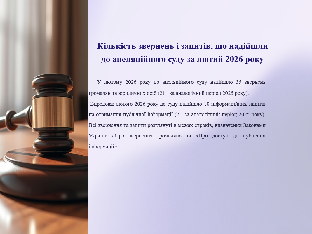 Кількість звернень і запитів, що надійшли до апеляційного суду за лютий 2026 року